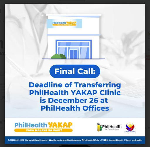 Final Call: Deadline of Transferring PhilHealth YAKAP Clinic is December 26 at PhilHealth Offices